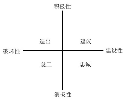 建议(Voice):采取主动的、建设性的努力来改善工作条件,包括提出改进建议、主动与上司以及其他团队成员一起讨论所面临的问题。建议常常作为一种积极的或建设性的回应被研究,如尝试着解决与管理有关的问题,或积极地帮助改善情形。忠诚(Loyalty):被动但乐观地等待组织环境有所改善,包括面对外部批评时能站在组织的一边,以及相信组织及管理层会做出“正确的事”。