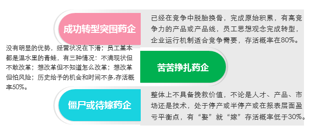 就现实而言,中国医药产业正在分化:第一部分药企在挣扎中成为僵尸或待嫁,处在下沉通道;第二部分药企成功完成转型,处在上升通道;第三部分药企还在苦苦挣扎,处在徘徊通道。这是一幅中国医药产业动态发展和沉沦图。处于下沉通道的药企,在遇到适当的机会并找到走出低谷的方法后可以进入上升通道;处于上升通道的药企,如果不能持续把握好机遇或陷入风险泥潭,也可能落入下沉通道;处于苦苦挣扎中的药企,本身就有两种选择,也是两种命运。这就是当今中国医药产业的现实。