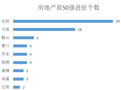 沈阳市、大连市TOP50房企进驻相对较多;2个城市已经有10家以上TOP50房企进驻。