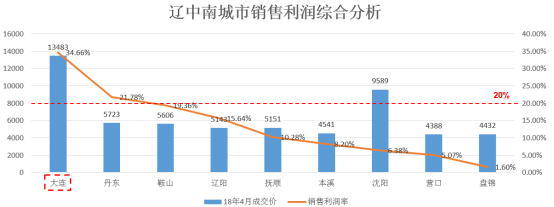从销售利润率看,大于25%的城市有1个,为大连。销售利润率=(房价-地价-土地外成本-增值税)/房价,土地外成本按3600元估算。增值税=(房价-地价)*10%/(1+10%)-3600*8%。需要注意的是:销售价格为2018年4月份价格,楼面价为近6个月成交楼面价。