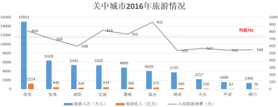 旅游反映了城市休闲配套资源情况和因旅游带来的短时流动人口流向。关中城市群2016年旅游人次达4.98亿人,关中城市群2016年旅游收入3638亿元;其中,西安为重要的旅游城市,单个市旅游人次占整个关中城市群的21%;关中城市群2016年人均旅游消费731元,超过整体水平的城市有4个,分别为西安、运城、渭南、临汾。