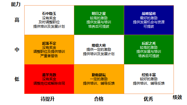 第二梯队(白色区域):需要发展的对象,根据具体情况提供培训辅导或是岗位调整,争取培养后进入第一梯队。