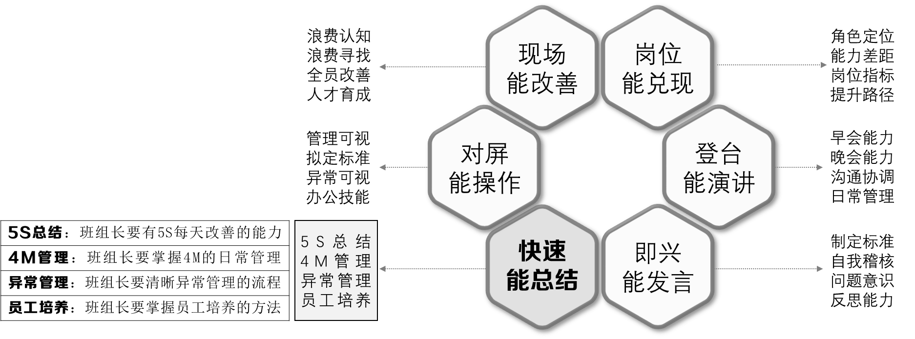 快速能总结:基层班组长在班组长这个岗位上,必须要具备每天、每周、每月的总结能力,异常每天时有发生,针对异常的发生,班组长总结的结果是什么?如何进行改善进而不断的降低异常的损失?现场5S管理的水平没有持续的提升,班组长如何提升现场5S管理的水平?针对员工的培养,如果通过工作教导的方式进行多能工培养,确保班组人员技能的及时补充。可以说没有总结,就没有提升,没有改善,就没有提升。
