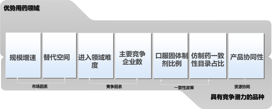 我们曾给国内一家企业做战略咨询,在考量并购企业和收购批文时,设计了一套仿制药一致性评价的产品筛选模型,设置回顾性指标和前瞻性指标,从市场因素、竞争因素、政策因素及资源协同因素为该企业找到适合其未来发展的产品领域。