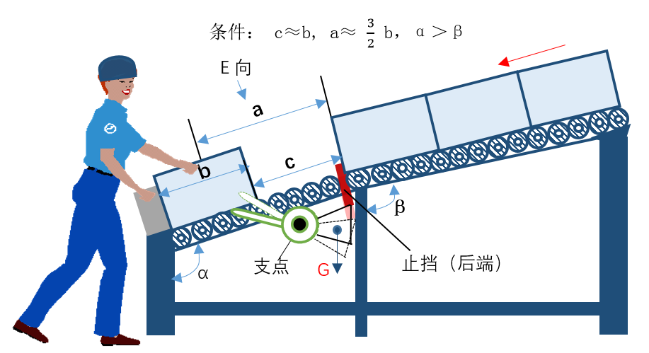 在利用斜面搬运箱子的场景中,箱子下滑后紧密堆叠,导致搬运者抠取最上层箱子时,因上层箱子的压力而十分费力。止挡装置的出现有效解决了这一难题,它基于杠杆原理设计,看似简单,实际使用时却能大幅提升操作的省力程度。
