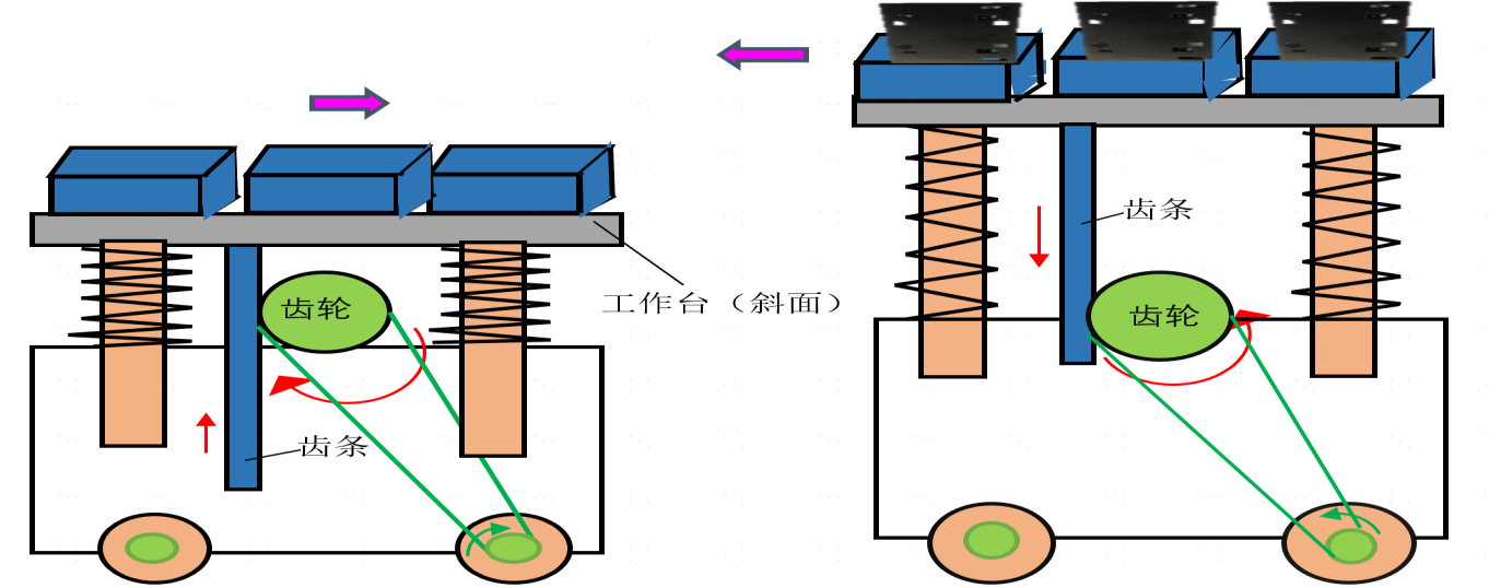 物品重力促使齿轮、齿条带动台车