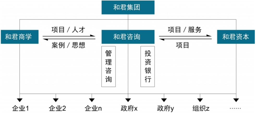 和君的“一体两翼”形成了两两互哺、相生互动、良性循环的业务生态效应,以“咨询+资本+人才”的综合服务实现客户价值倍增。咨询业务直面企业的真实问题,感知和研究最鲜活的经济胎动和商业实践,资本为咨询业务强化品牌力道、创新盈利模式,商学业务以理论与实战相结合的课程与方法,为咨询和资本业务提供优秀人才、理论工具和创新活力。