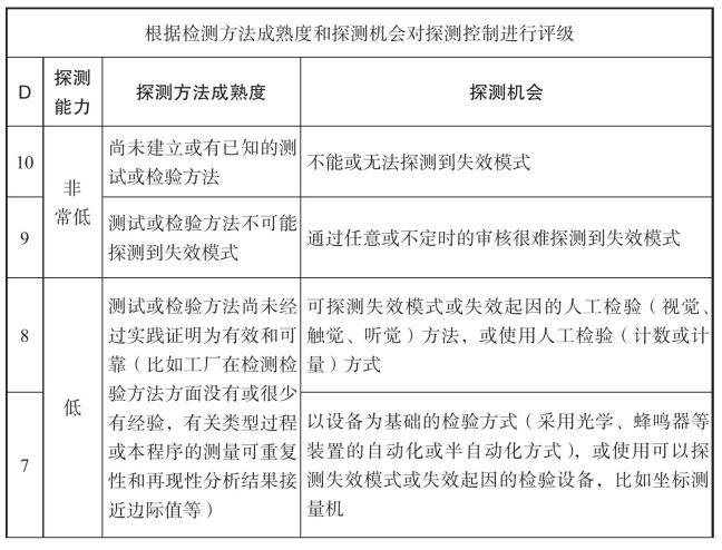 表2-8 PFMEA探测度评分表