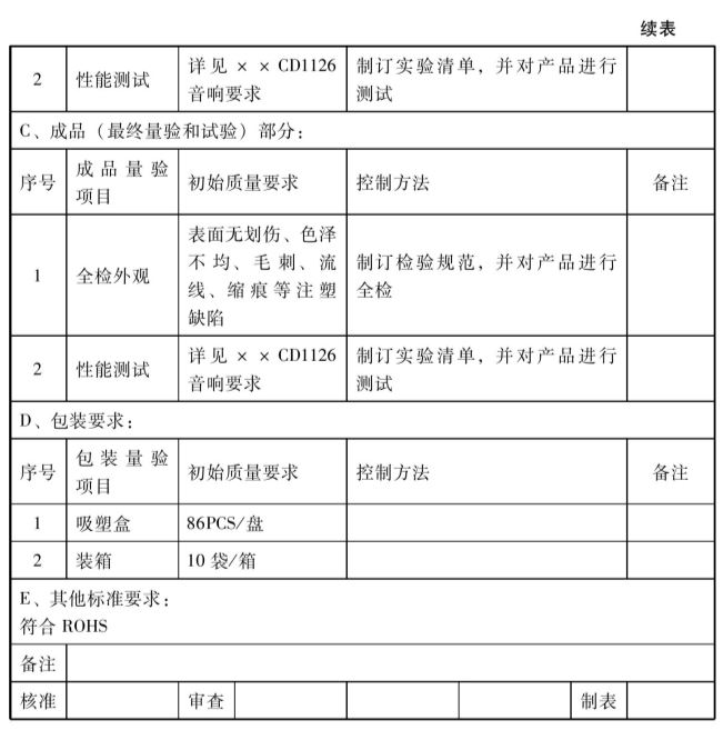 根据设计目标和可靠性目标、质量目标,就要策划初始用哪些材料,有些直接在市场上选用不同标准件即可,如电容、电阻等;有些要供应商配合打样,如塑胶结构件等,但要先把初始材料定出来,方便采购部安排供应商立即送样。参见表1-2-2。