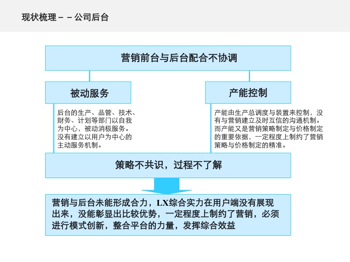 “价格公开、统一定价、款到发货”的营销政策,靠营销人员与用户的采购人员之间单线营销,根本实施不了。营销政策的差异,在产品同质化之下是否有效,完全取决于营销战略与营销模式的差异。LX需要系统梳理营销战略,尤其是进行营销模式的创新。