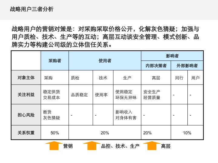 企业首先要回答“对谁营销”的问题。在工业品营销的交易对象上,除了用户的采购部门,企业还要与哪些部门哪些人进行进一步营销?通过“三者分析”,我们就可以初步判定用户中的哪些部门哪些人对企业所提供的价值最敏感,然后据此找到最合适的营销对象。营销对象选准了,交易的路径自然就会缩短。