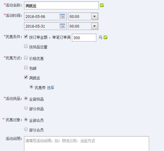 备注:优惠条件可以选择2种,一是按照订单金额,单笔满多少元自己依据行业设定,不要乱设置;二是按照货品总量。可以两者都选也可以二选一。当这些都设置完成后我们就可以点击“创建活动”,这个活动便完成了设置,就会显示在店铺当中。
