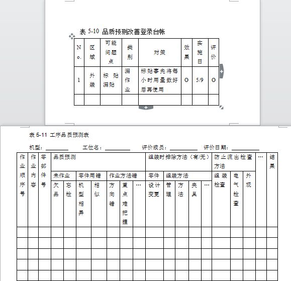 在逐一确认所有工艺项目时,为了不漏确认,一般应用表5-11所示工程预测问题表。此表中,先登录所有工艺项目。而品质预测的诸项目就是在上述第2步中经统计层别后的现状及历史的问题类别,而对策栏又分为2类:第1类是在制造生产过程中(例如组装过程中)的对策,也即在组装过程中保证不良不会发生,这是应优先考虑的对策。第2类为检查方法,即为防止不良流出而在制造工序中追加检查方法。
