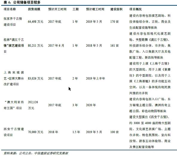 宋城已经开业的项目共有4家:杭州宋城景区、三亚宋城景区、丽江宋城景区、九寨沟宋城景区。2017年九寨沟因为地震因素还在重新修建,而三亚和丽江景区收入增速已经下滑至个位数,只有本部杭州还在增长。三亚和丽江景区的上限到底能到多少决定了公司单个项目的收入上限,而公司收入增长除了依赖项目外,新增项目更是重点。如表6-6所示。