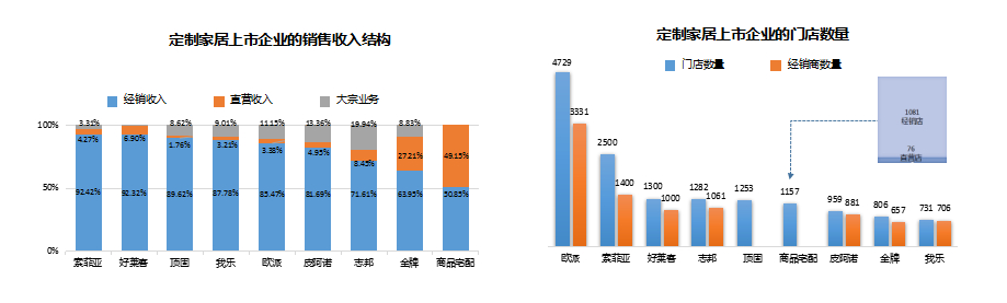 图2-3 定制家居上市企业的销售收入结构与门店数量