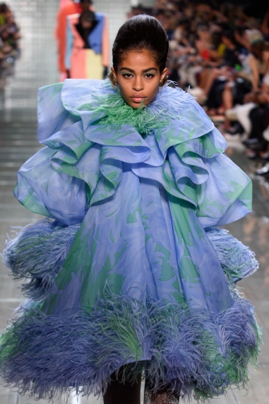柔软与坚硬性:柔软与坚硬不一定需要通过面料的质感来表现,利用色彩也可以表现出这些性质。明度高且纯度低的色彩给人柔软柔和的感觉,低明度、低纯度色彩则表现出坚硬感。如图8-31、图8-32所示,同样材质的服装,暖色调给人柔和、柔软的感觉,而冷色调的蓝绿比较之下增加了几分坚硬感。