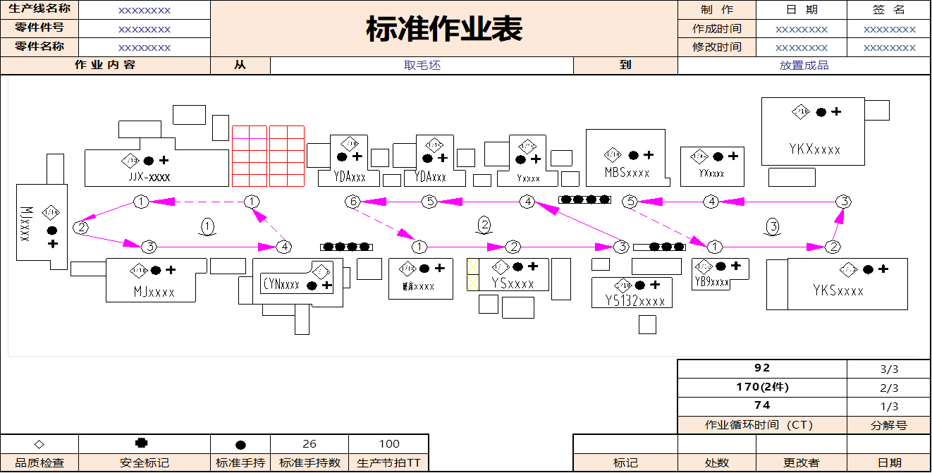用图表表示每个作业者的作业范围,其中填入整个生产线设备配置、C.T、T.T、作业顺序、标准手持、物流方向、检查品质频度及安全注意事项等内容。上级主管能够通过标准作业表评价现场监督人员的能力。因为标准作业表必须通过工序的作业改善频繁地进行修正,如果没经过修改的标准作业表长期张贴在那里,上级管理人员就会判断出该监督人员没有努力进行作业改善。