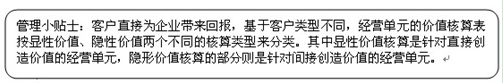 自主经营的价值核算表就是按照不同客户类型所创造的不同价值(显性价值和隐性价值)来进行分类。其中显性价值核算的部分是针对直接创造价值的经营单元,隐形价值核算的部分则是间接创造价值的经营单元。